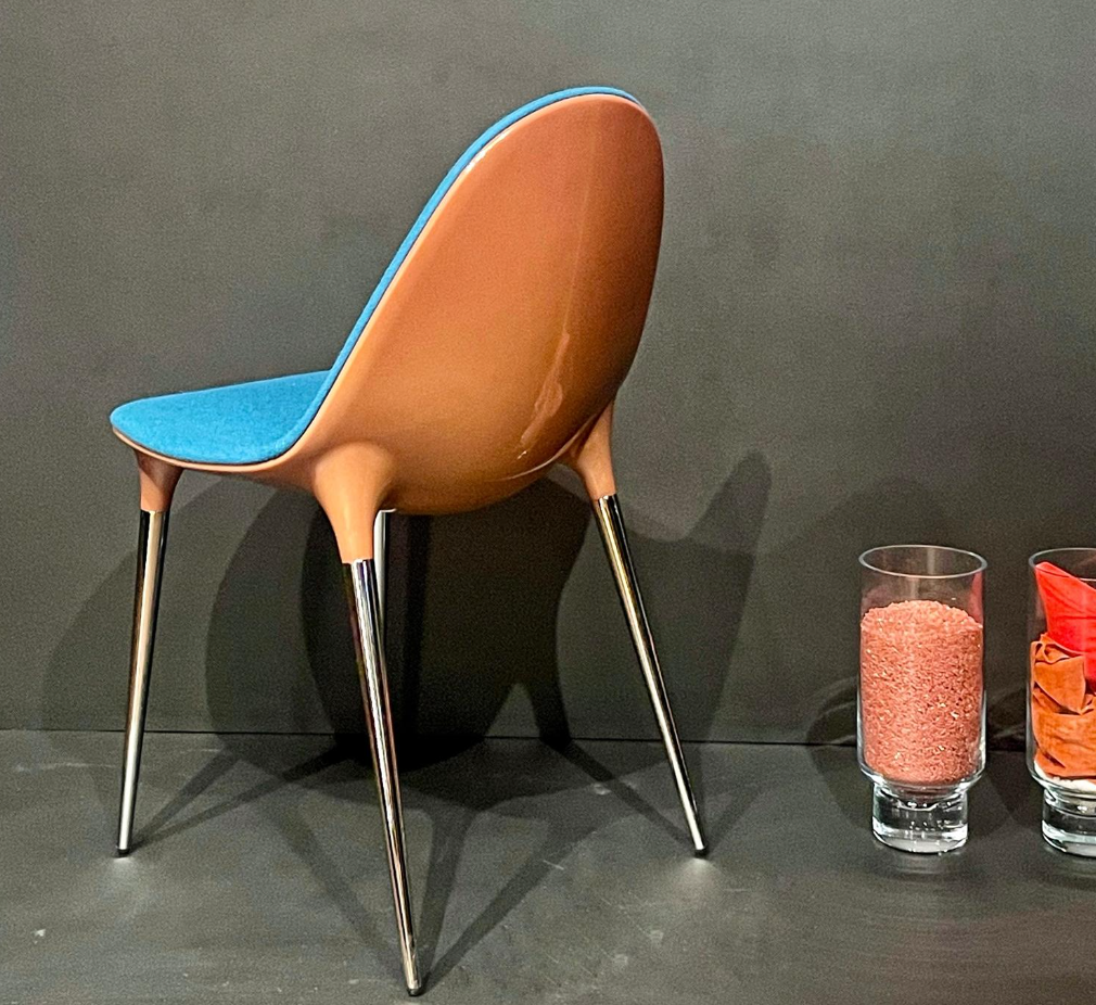 Grazie a un processo tecnologico brevettato, siamo in grado di rigenerare i rifiuti industriali Cassina in materiale termoplastico modellabile. Con un approccio "chiavi in mano", abbiamo riproposto per Cassina alcuni modelli di sedie presentati alla Design Week 2024.